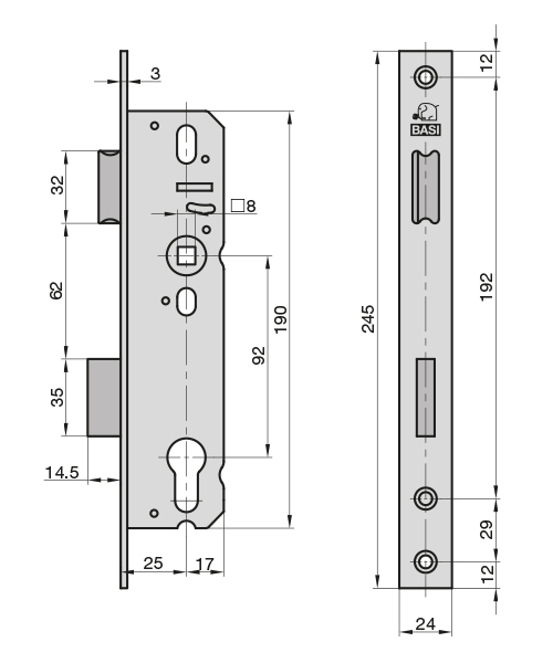 BASI-Rohrrahmenschloss ES 958, Dorn 25, Entf. 92mm, bündig