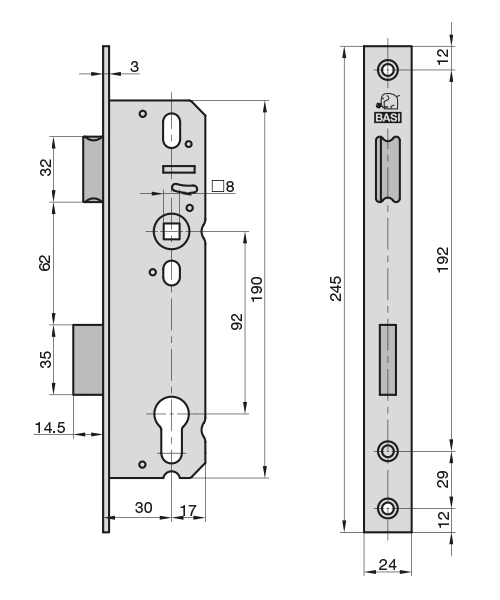 BASI-Rohrrahmenschloss ES 958, Dorn 30, Entf. 92mm, bündig