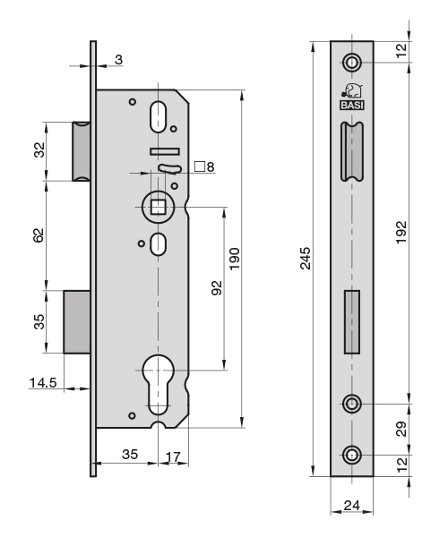 BASI-Rohrrahmenschloss ES 958, Dorn 35, Entf. 92mm, bündig