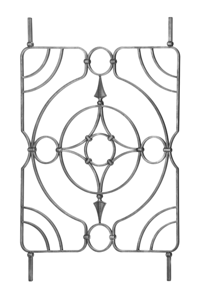 Designelement CITY aus Flachmaterial mit 4 Befestigungsenden aus Vierkantmaterial mit einem Ring in der Mitte.