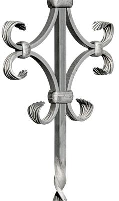 Geländerstab aus Vierkantmaterial mit zwei Drehungen und einem Motiv aus 4 C-Bögen aus Flachmaterial.