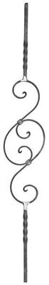 Geländerstab, zweimal gedrillt, mit eingesetztem Ornament aus zwei großen S-Bögen aus Flachmaterial in der Mitte und Stabenden aus Vierkantmaterial.