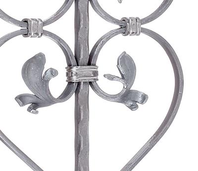Geländerstab aus Vierkantmaterial mit großem Barock-Ornament aus 4 asymmetrischen S-Bögen aus Flachmaterial mit ausgeschweiften Enden.