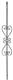 Geländerstab aus Vierkantmaterial mit einem Ornament aus zwei asymmetrischen S-Bogen-Paaren aus Flachmaterial; die breiten Enden sind nach außen ausgerichtet.