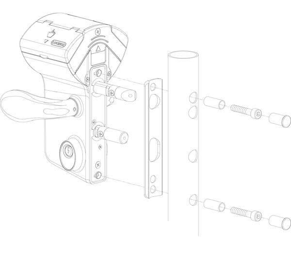 Mechanisches Codeschloss VINCI, Typ LMRQ V2, mit Aluminium-Gehäuse und Edelstahlmechanismus für Drehtore für runde Profile von 40 - 60 mm Stärke.