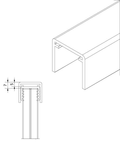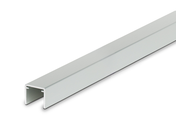Nutprofil (Modell 2115) aus natureloxiertem Aluminium, U-Form mit innenliegender Nut für passende Endkappe (auf Anfrage erhältlich).