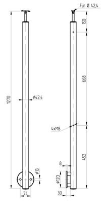 Rundpfosten aus Edelstahl mit beweglichem Handlaufhalter, Gewindebohrungen und seitlicher Platte für seitliche Montage.