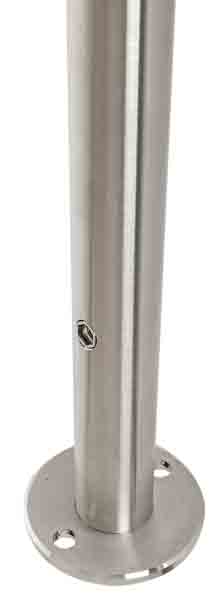 Rundpfosten aus Edelstahl mit starrem Handlaufhalter, Gewindebohrungen und Bodenplatte zum Aufschrauben. Als Endpfosten verwendbar.