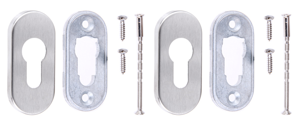 Schlossrosetten-Paar aus Edelstahl, ovale Form, mit PZ-Lochung und Befestigungsschrauben.