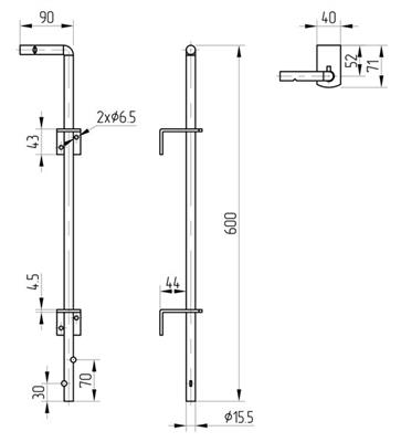 Einfacher Torriegel aus feuerverzinktem Stahl mit geradem Griff und 2 Führungswinkeln zum Anschrauben.