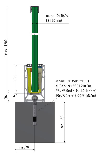 • geeignet für Glasstärken zwischen 15 mm und 21,52 mm und Glashöhen von max. 1200 mm