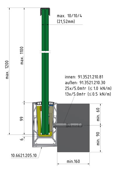 - geeignet für Glasstärken zwischen 15 mm und 21,52 mm und Glashöhen von max. 1200 mm