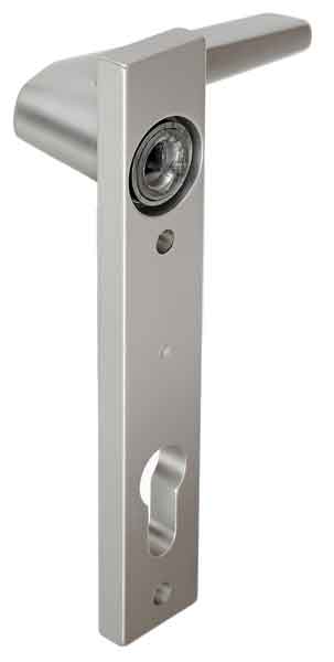 Drehbarer Türdrücker mit geradem Griff, von edi aus Aluminium F1 auf eckigem Langschild mit PZ-Lochung und sichtbarer Befestigung - zur Montage auf der Türinnenseite.