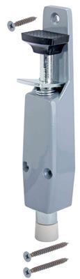 Türfeststeller mit Aluminiumgehäuse, silberfarben lackiert, mit Federmechanismus, zur Montage an die Tür.