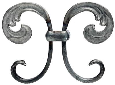 Zierelement "Mozart" aus Flachmaterial; bestehend aus 2 C-Bögen mit einem ausgeprägten Blattende und offenem Bund zum Anheften an Stäbe aus glattem Vierkantmaterial.