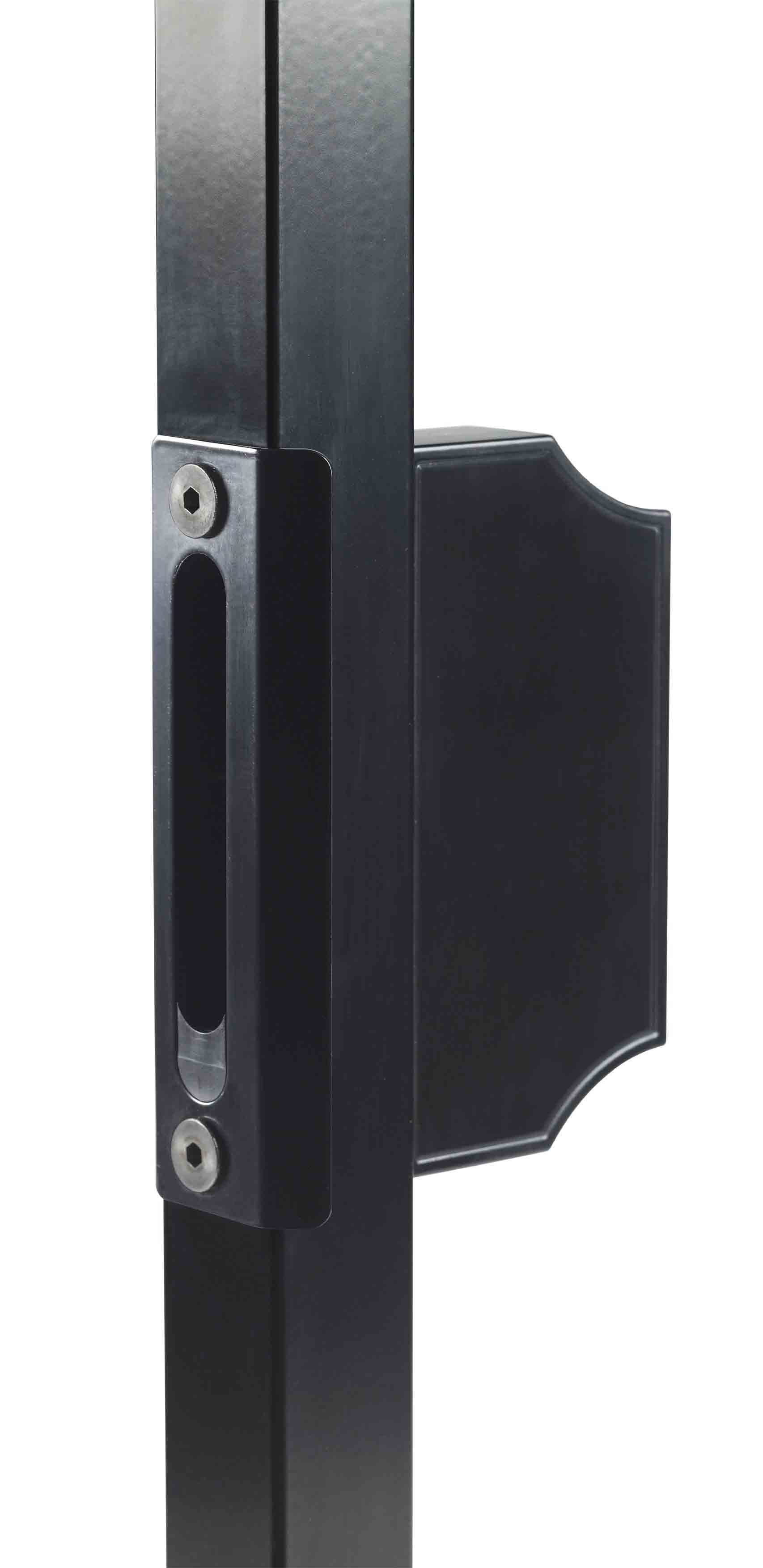 Ziergitteranschlag SPKZ-TK mit Polyamid-Gehäuse und Gegenkasten für Industrieschlösser bzw. Drehtore - optisch passend zu den Ziergitterschlössern. Durch die geringe Materialstärke der Stoßplatte von nur 1,5 mm kann dieser Anschlag auch bei einem geringen Abstand von Tor und Pfosten verwendet werden.